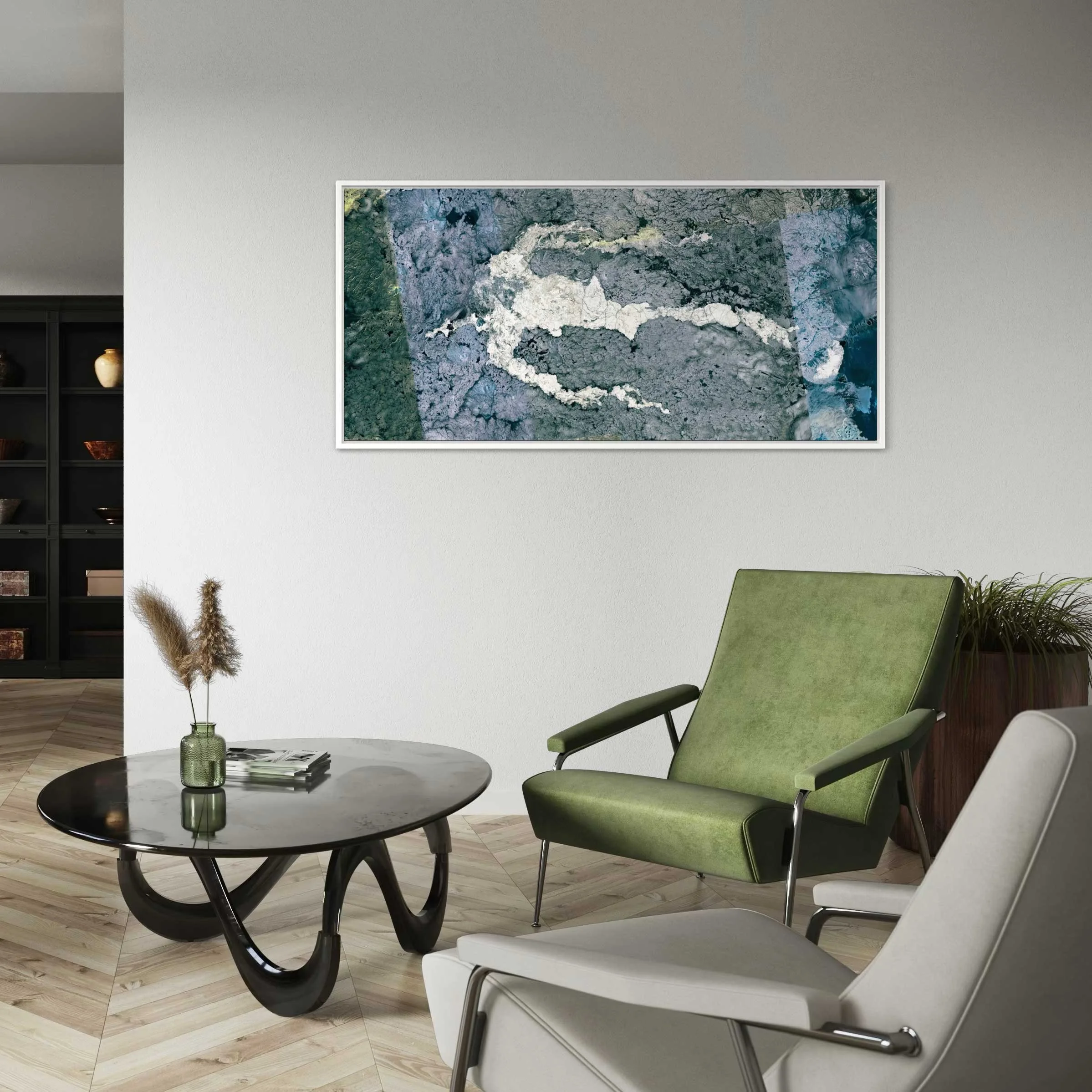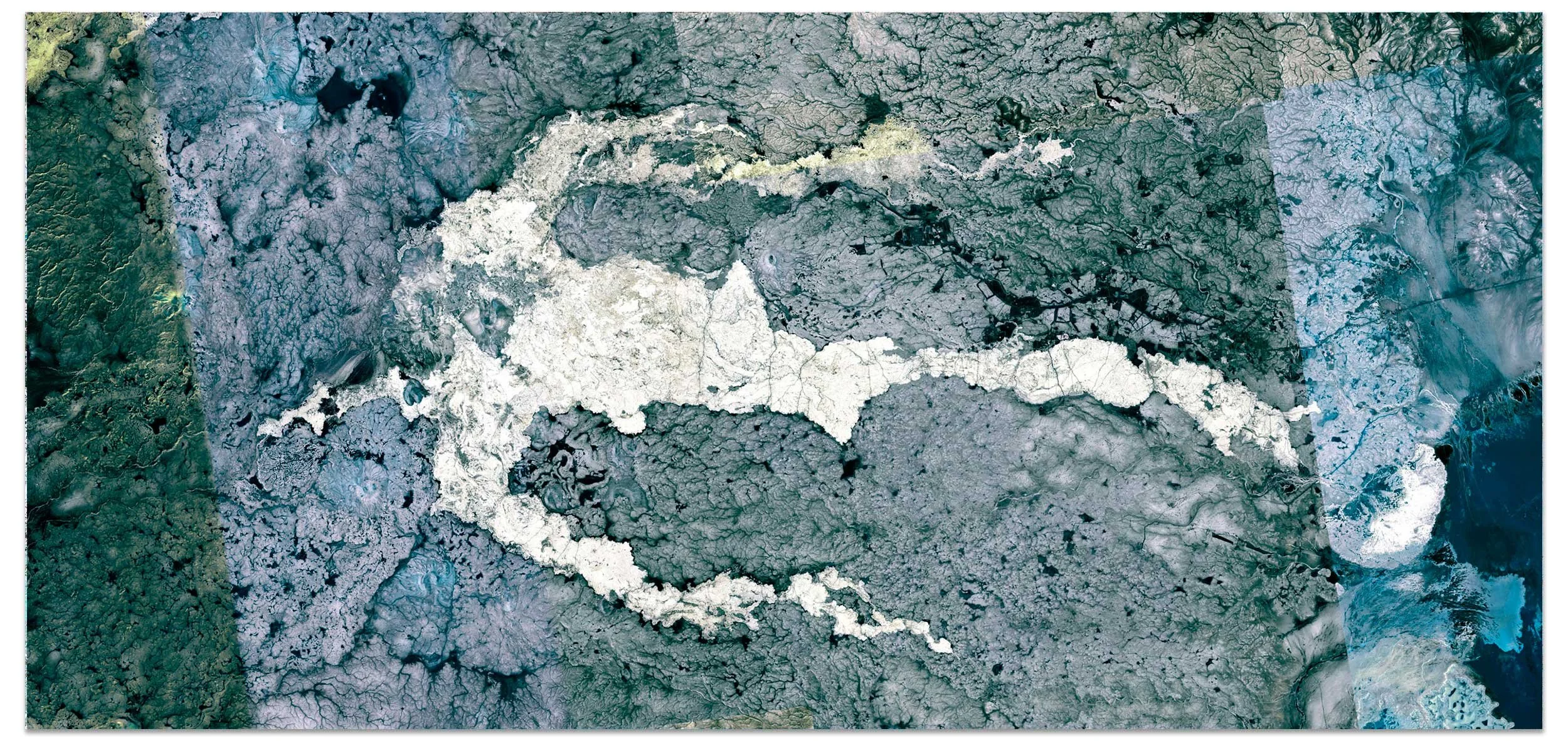 As-Sabeyah captures the dramatic textures of Saudi Arabia’s volcanic landscapes, where lava fields and ancient flows appear as abstract strokes across the desert. Seen from orbit, the rugged terrain transforms into a monochrome canvas, oscillating between mineral density and luminous traces of geological time. This Ultradistancia artwork invites viewers to contemplate the hidden beauty of geology and the powerful forces that shape the Earth.