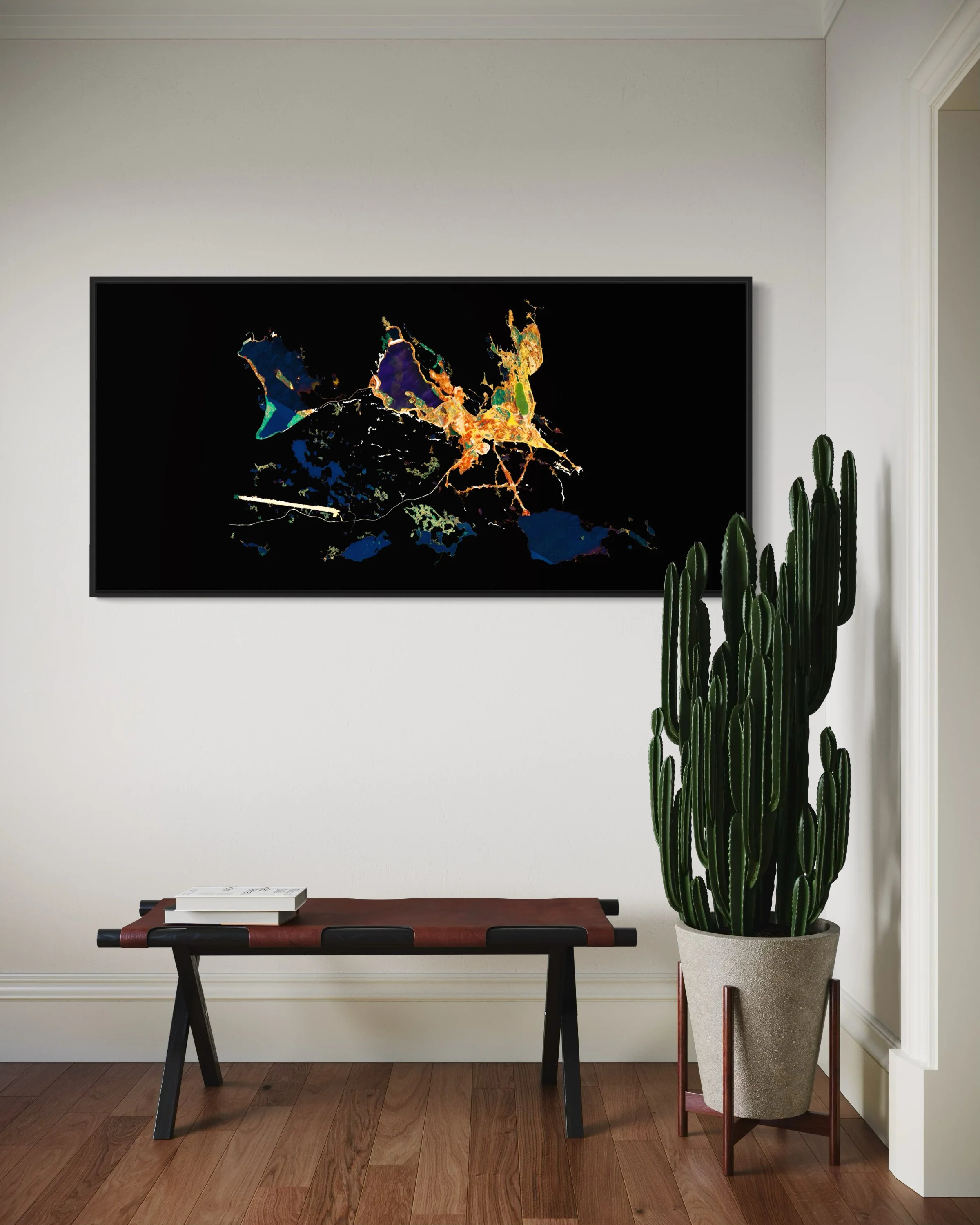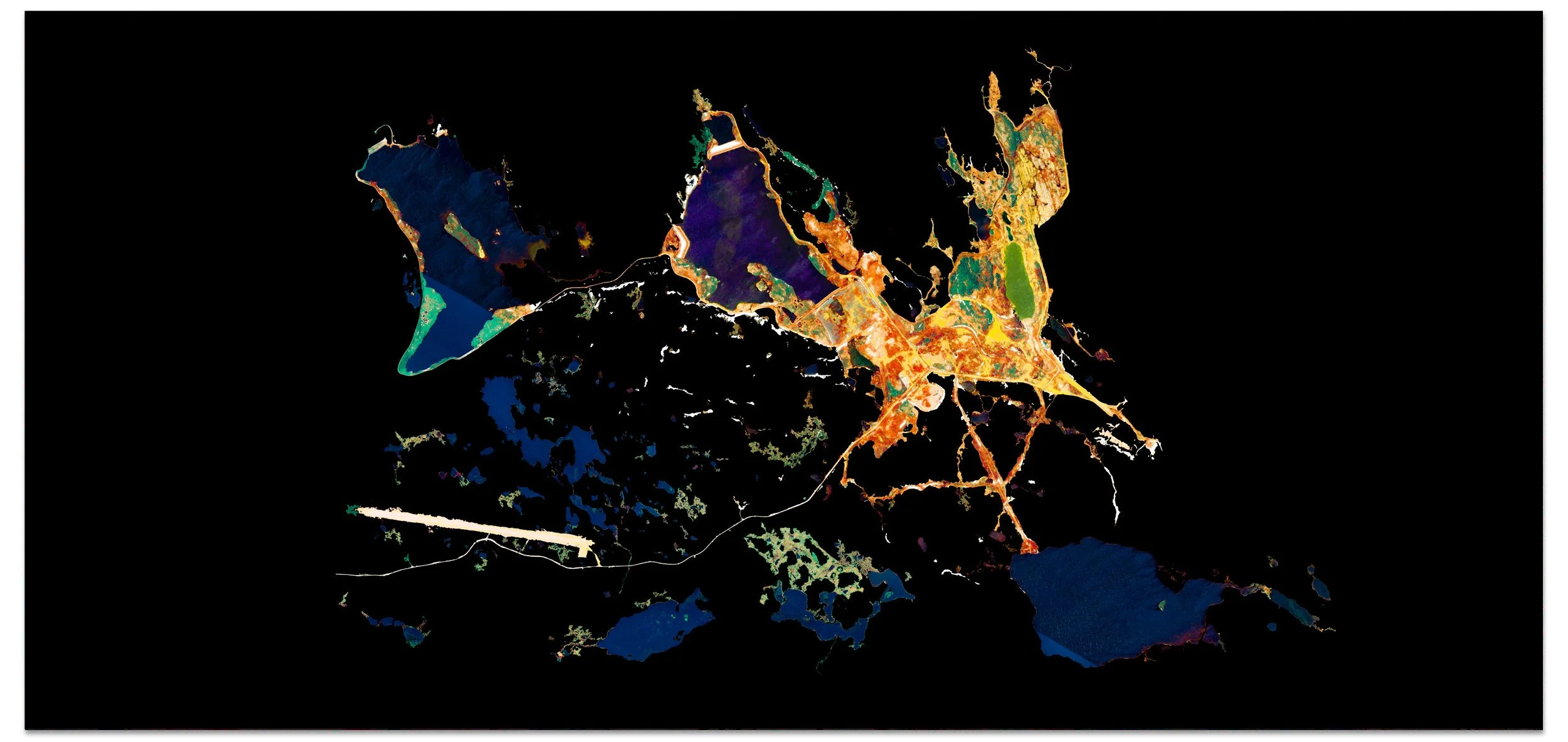 Once an active mine producing over 750,000 ounces of gold, Hope Brook spans 24,475 hectares with extensive infrastructure. The site’s geology, shaped by volcanic-sedimentary formations and rich mineralization, creates a compelling abstract composition from above. A satellite fine art piece capturing the striking landscape of an advanced-stage gold deposit in Newfoundland.